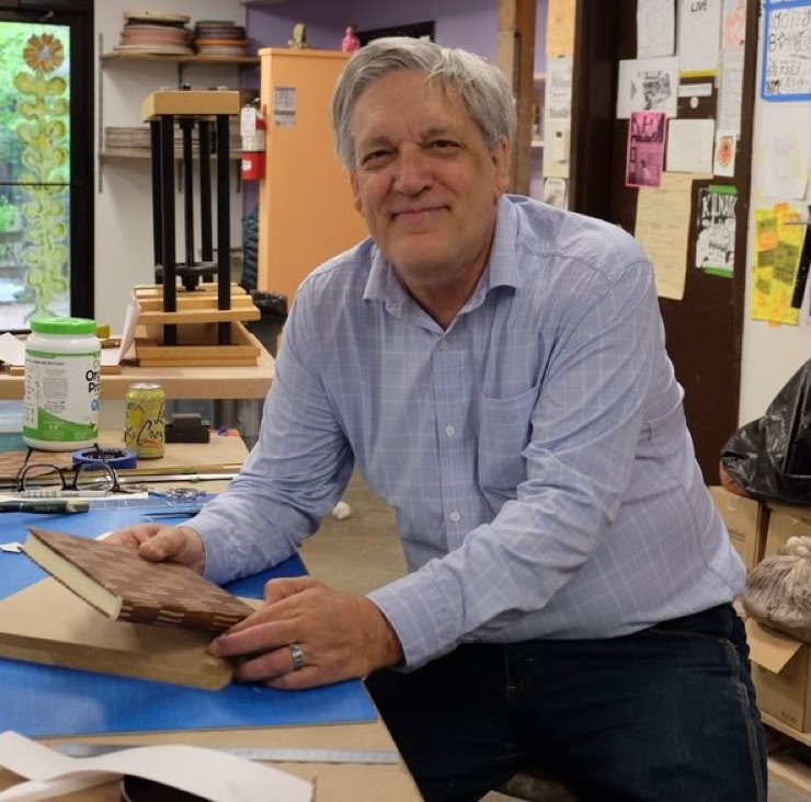 He graduated from the two year bookbinding and conservation program at NBSS in 1992. Students at NBSS sit at a bench for six (or more) hours a day and binding and repairing books for two academic years. Prior to studying at NBSS, Mark worked in the conservation department at The First Church of Christ, Scientist in Boston where he first began to repair books in 1987 carefully following the instructions in Jane Greenfield’s repair manual.